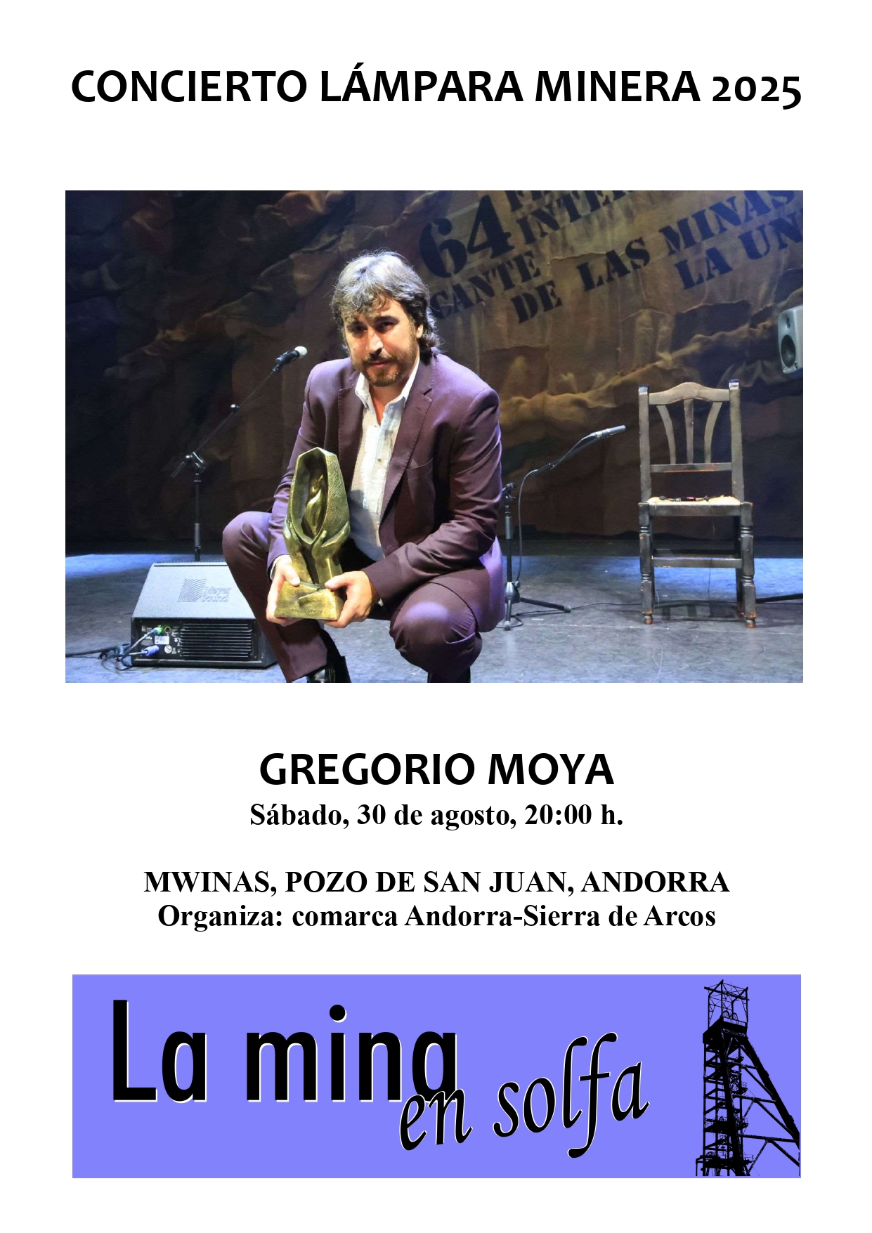 El próximo sábado 30 de agosto a las 20:00 horas, el Museo Minero de Andorra ubicado en el Pozo de San Juan, acogerá un año más, un concierto muy especial enmarcado en la decimoctava edición del ciclo La mina en solfa. Su protagonista será Gregorio Moya, reciente ganador de la Lámpara Minera del Festival Internacional del Cante de las Minas 2025.