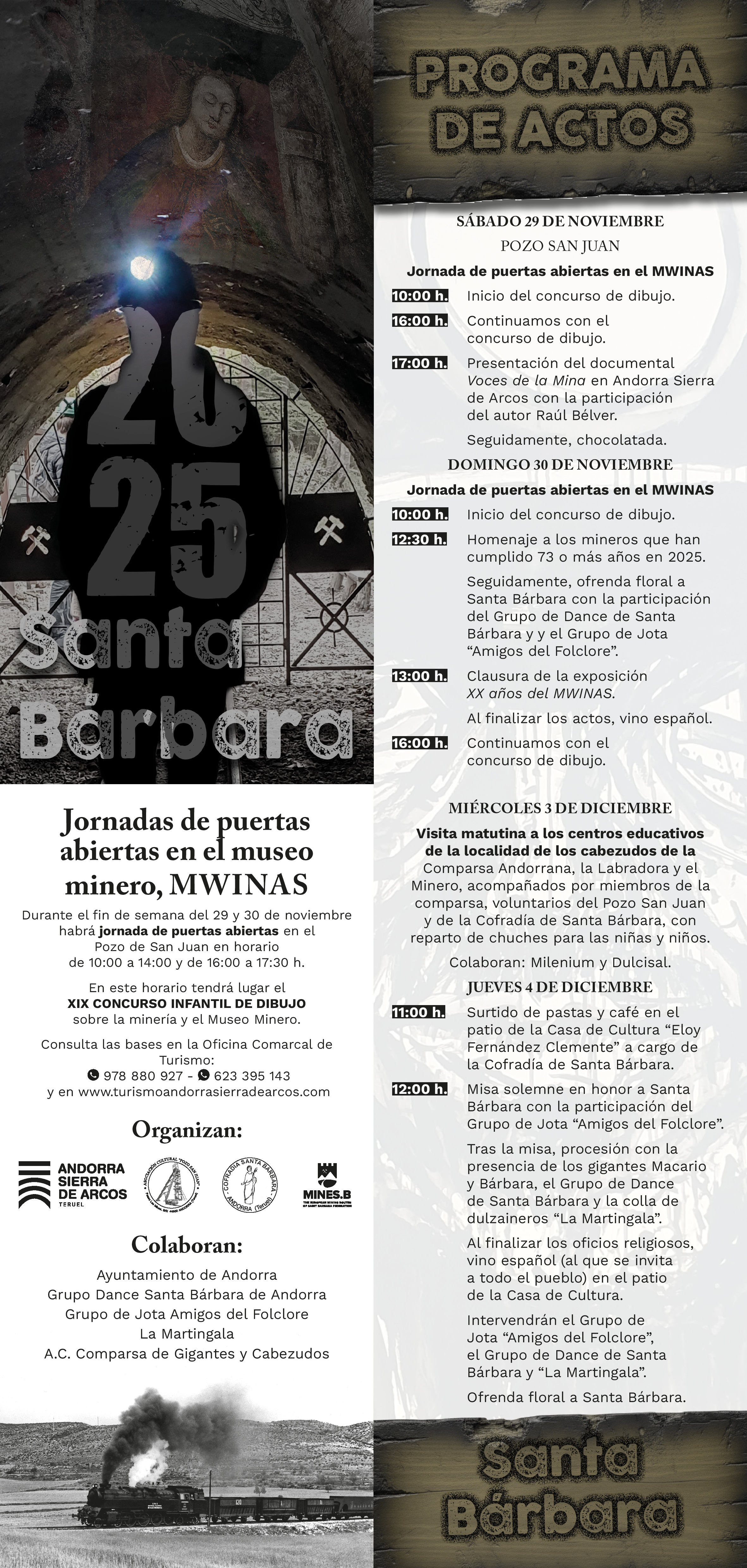 Como todos los años, dentro de unas jornadas de puertas abiertas, se celebrará la decimonovena edición del concurso de dibujo infantil y juvenil y se presentará el documental "Voces de la mina en Andorra Sierra de Arcos" de Raúl Belver. Ya el domingo 30 se homenajeará a los mineros más antiguos con la participación de los danzantes y gitanillas de Santa Bárbara y "La Martingala" y el grupo de jota "Amigos del folclore".