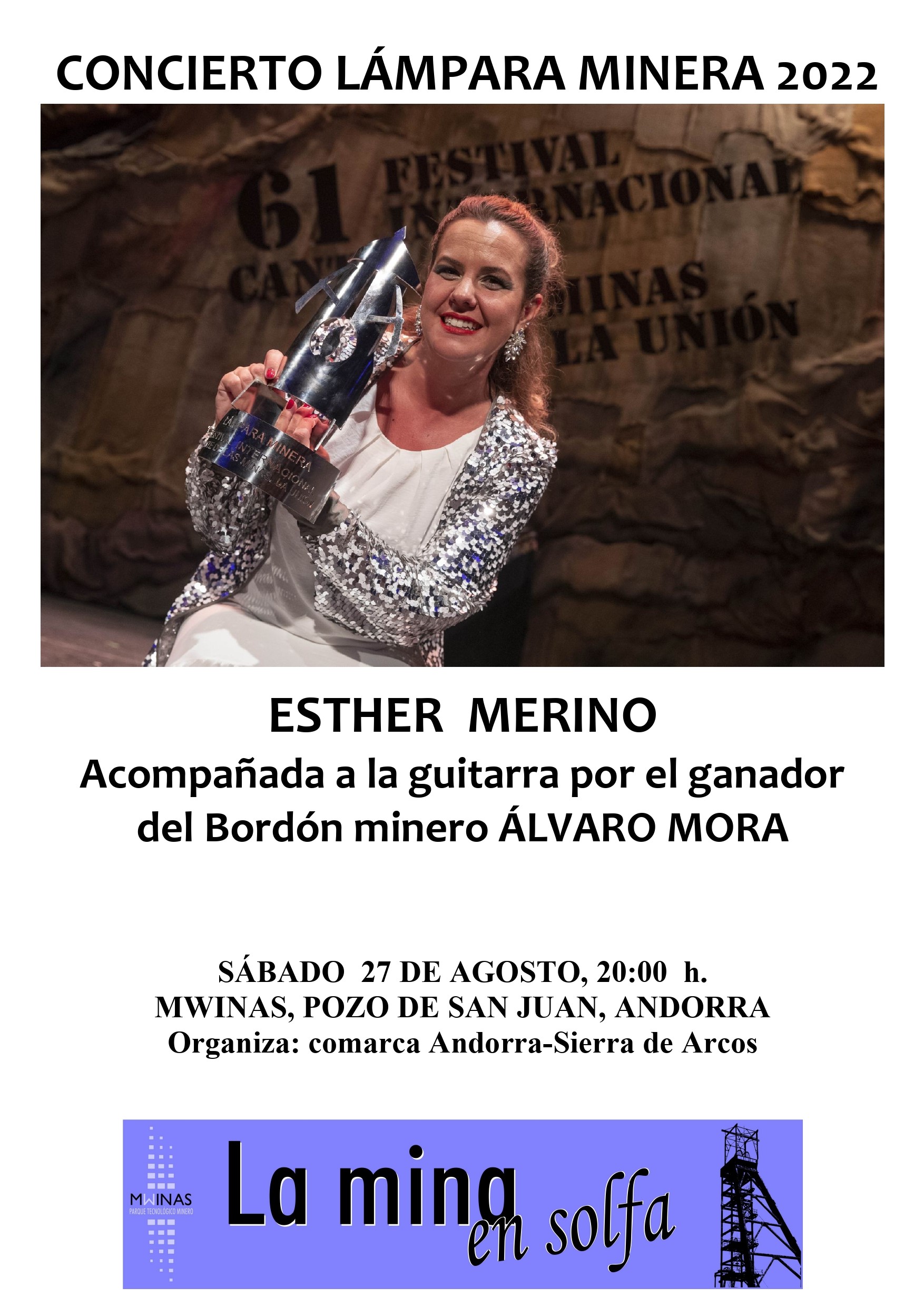 Y un año más, y ya son quince, el pozo de San Juan, sede del Museo Minero de la comarca Andorra-Sierra de Arcos, MWINAS, será el lugar donde la ganadora de la Lámpara Minera dará uno de sus primeros concierto tras recibir el galardón. En esta actuación además vendrá acompañada del guitarrista Álvaro Mora, ganador del Bordón minero en esta edición del festival.